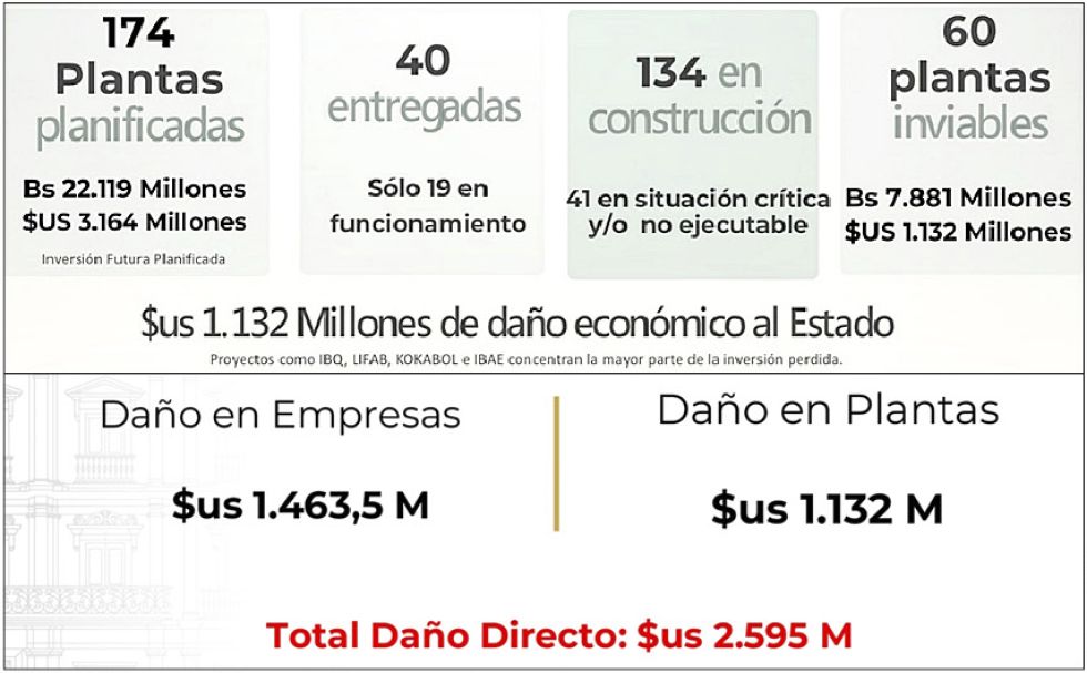 De 174 plantas planificadas por la administración del MAS, 60 son inviables, y de las que aún están en construcción, la mayoría, el Gobierno recibirá solo “carcasas” pese a la anunciada industrialización.