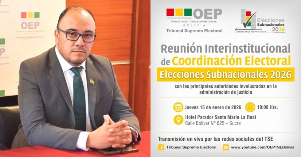 El Tribunal Supremo Electoral (TSE) sostendrá este jueves 15 de enero, a las 10:00 en la ciudad de Sucre, una reunión interinstitucional con representantes del Órgano Judicial, el Tribunal Constitucional Plurinacional (TCP) y la Fiscalía General del Estado.