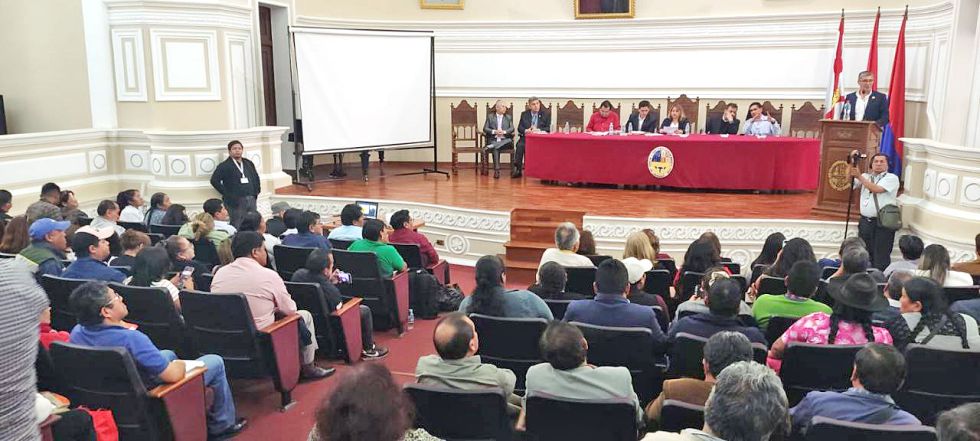 SOCIALIZACIÓN. La exposición de los ministros de Estado en el Paraninfo Universitario. Foto: Gentileza El ministro de Economía, José Gabriel Espinoza, anunció este jueves en Sucre que el Gobierno enviará a la Asamblea Legislativa Plurinacional un proyecto de ley para garantizar la universalización de las facturas en el descargo de impuestos. La autoridad también adelantó que próximamente se aplicará arancel cero para la línea blanca y comunicó que se busca restituir el 100% del crédito fiscal en la compra de combustibles mediante otra norma remitida al Legislativo.