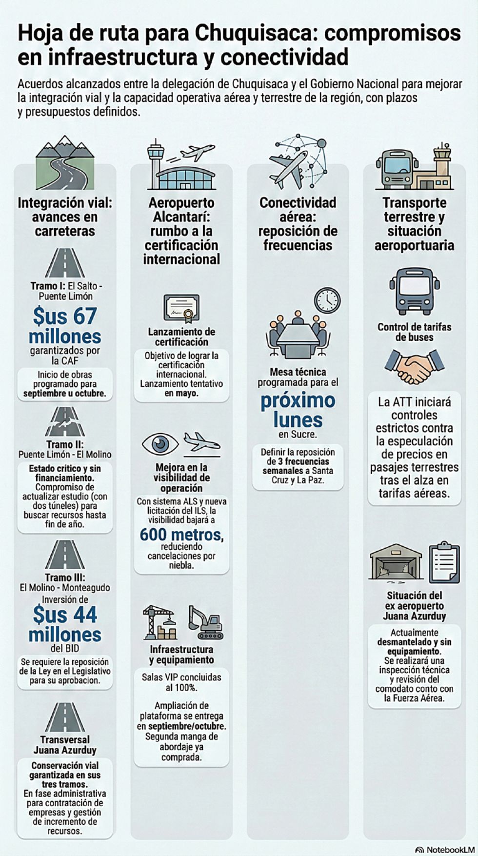 Tras dos jornadas de reuniones en La Paz, la delegación institucional de Chuquisaca, compuesta por unos 30 representantes, logró garantizar el financiamiento para tramos clave de la Diagonal Jaime Mendoza y el equipamiento del aeropuerto Alcantarí. La reposición de itinerarios aéreos, aunque cuenta con luz verde del Gobierno, quedó condicionada a una mesa técnica definitiva que se instalará el próximo lunes en la capital.