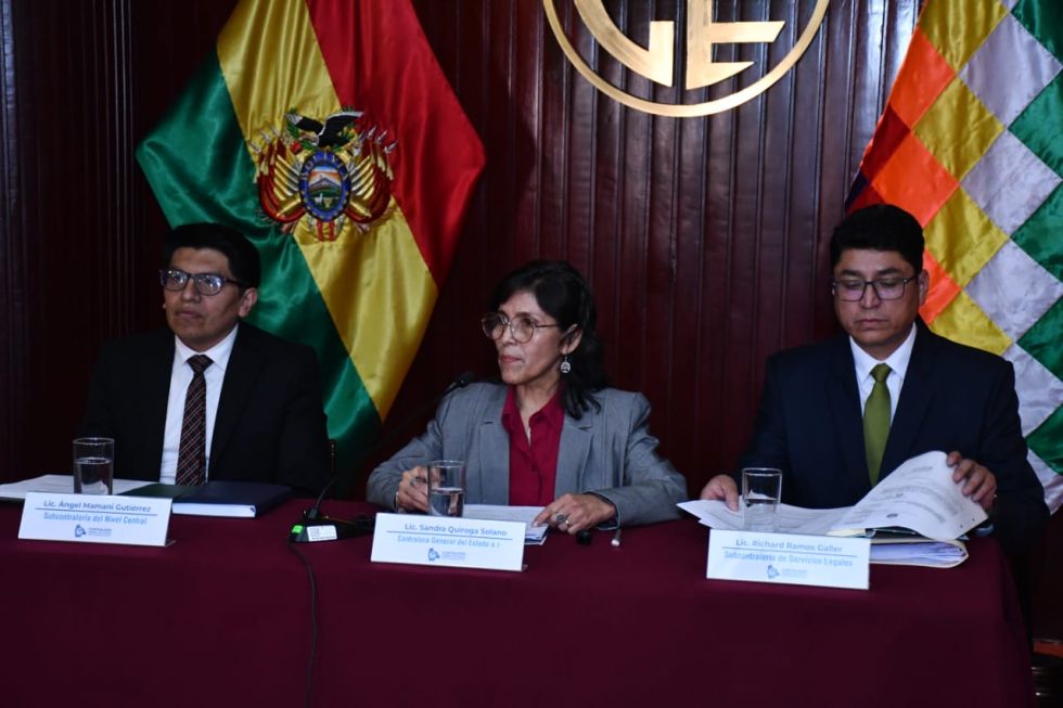 La contralora interina, Sandra Quiroga (c), brindó este viernes una conferencia de prensa. Foto: APG La contralora interina, Sandra Quiroga, afirmó que la institución a su cargo trabaja “arduamente” en la fiscalización de rendiciones de cuentas e informes de exautoridades y respaldó la ampliación del plazo de arraigo, al considerar insuficiente el tiempo establecido por la Ley 1352, vigente desde diciembre de 2020.