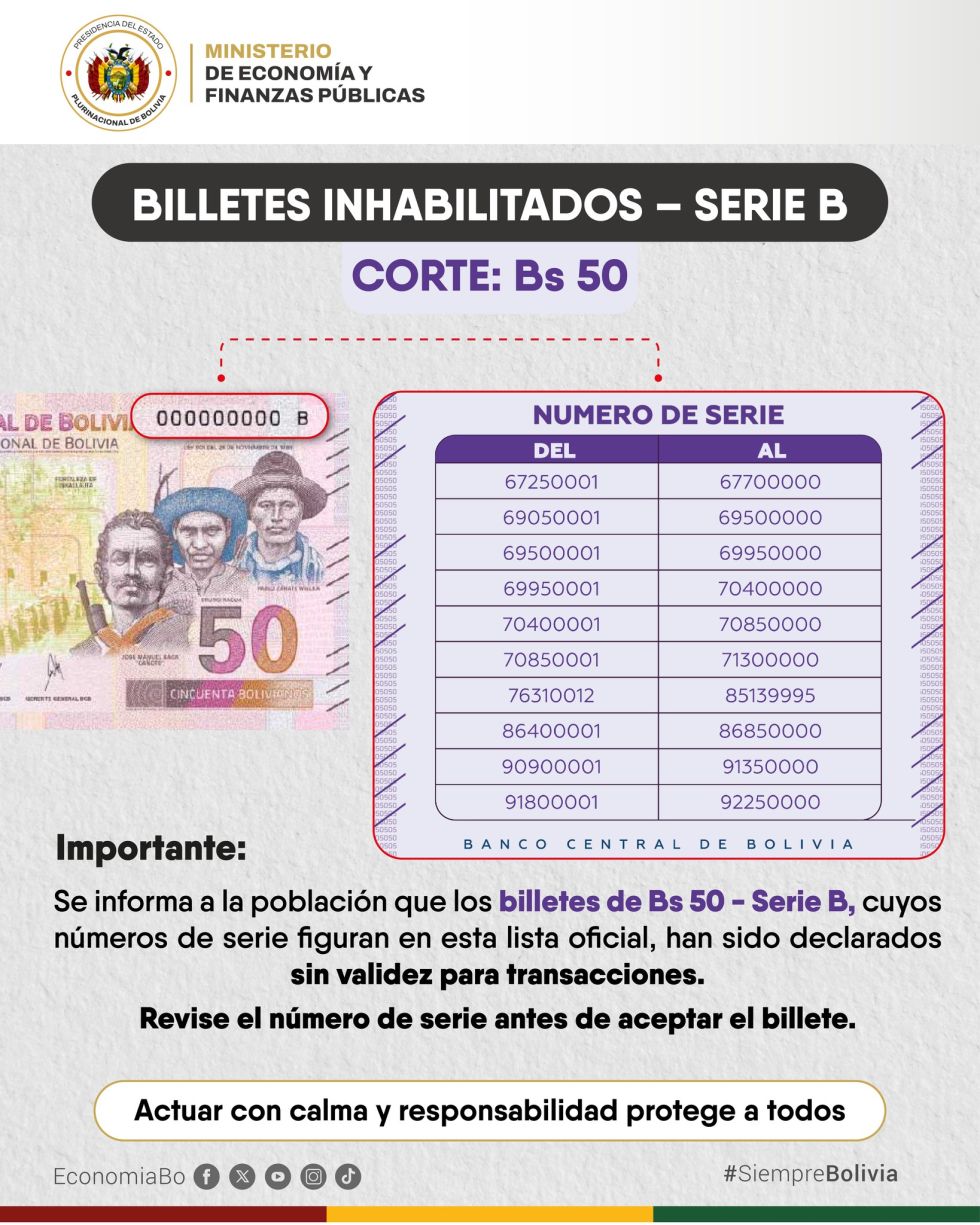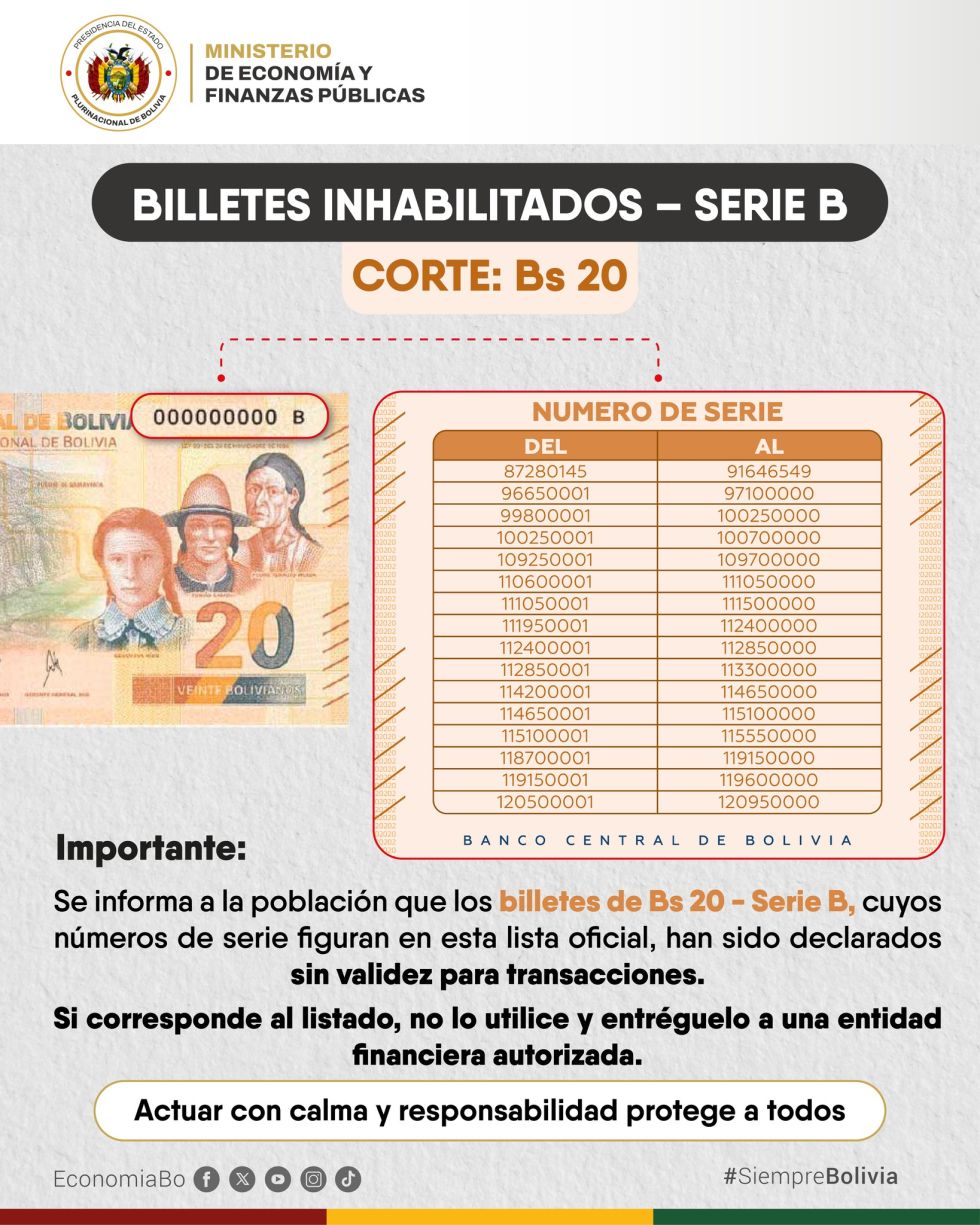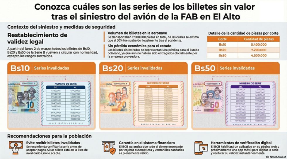 El Banco Central de Bolivia (BCB) anunció este sábado que, a partir de este lunes 2 de marzo, los billetes de Bs 10, Bs 20 y Bs 50 de la Serie B recuperan su plena validez legal y podrán circular con total normalidad en todo el país. La decisión pone fin a la incertidumbre generada tras la suspensión temporal decretada la madrugada del sábado como medida preventiva por el accidente aéreo en El Alto, que transportaba un lote de este material monetario.