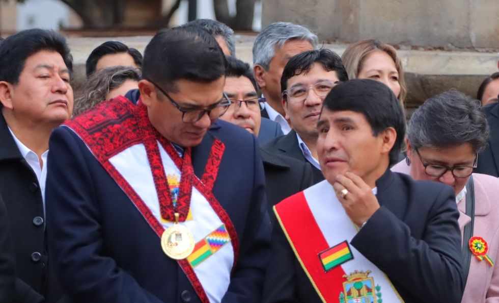 El alcalde de Sucre, Enrique Leaño (i), y el gobernador de Chuquisaca, Damián Condori. Foto: Archivo Tras el anuncio del presidente Rodrigo Paz, del inicio de la fase técnica del plan 50-50 para redistribuir recursos, la cautela marcó las reacciones de las principales autoridades en la región.