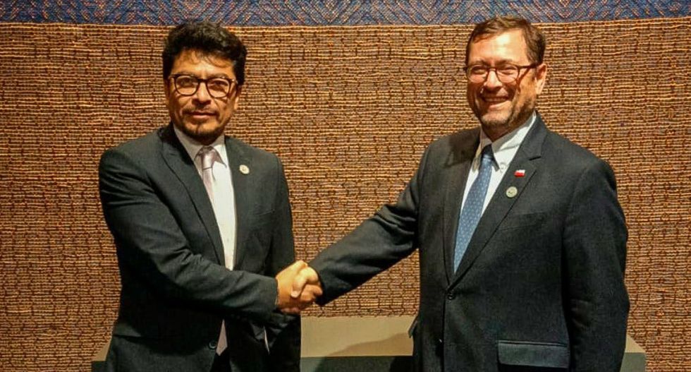 Los cancilleres de Bolivia, Fernando Aramayo (i), y de Chile, Francisco Pérez. Foto: Cancillería de Bolivia Los cancilleres de Bolivia, Fernando Aramayo, y de Chile, Francisco Pérez, decidieron impulsar acuerdos en al menos siete ejes como seguridad y energía, en el marco de la X Cumbre de la Comunidad de Estados Latinoamericanos y Caribeños (Celac).