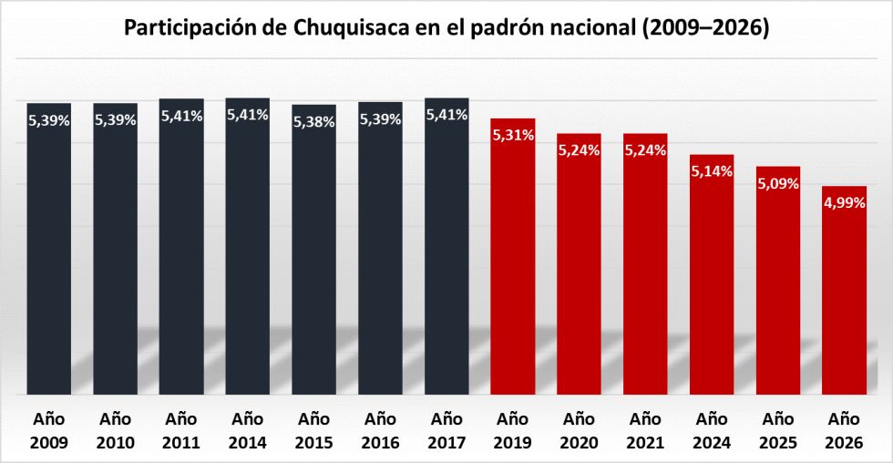 No obstante, a partir de 2017 y con mayor claridad desde 2019, se inicia una tendencia descendente que no se ha detenido. La proporción cae a 5,31% en 2019, desciende a 5,24% en 2020 y 2021, continúa reduciéndose a 5,14% en 2024 y 5,09% en 2025, hasta situarse en 4,99% en 2026. Este último dato no es menor, ya que marca el quiebre de un umbral simbólico: Chuquisaca deja de representar al menos el 5% del electorado nacional.