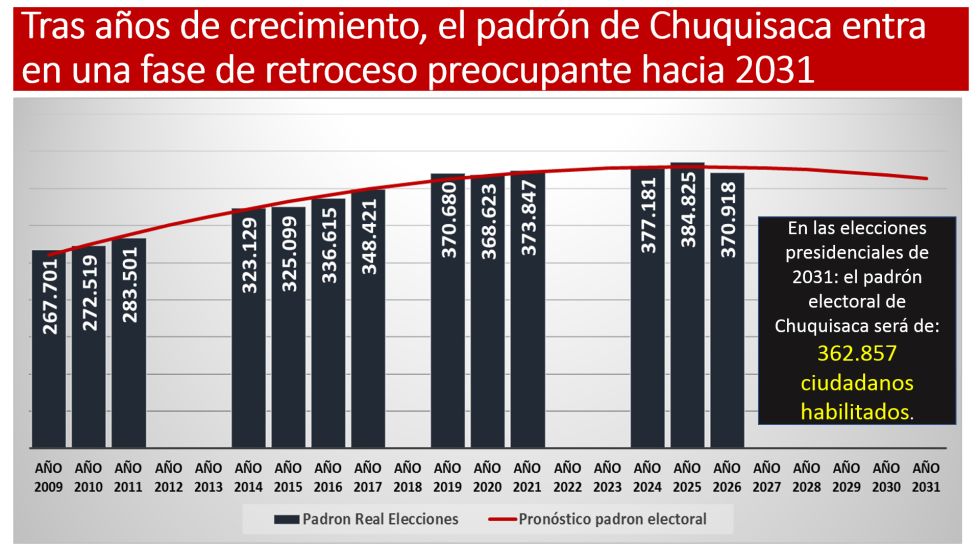 El análisis se vuelve aún más relevante al incorporar una mirada prospectiva. A partir de la proyección construida con datos de los 13 procesos electorales analizados, se estima que el padrón de Chuquisaca podría alcanzar los 362.857 electores en 2031. Este dato implica una reducción de 8.061 votantes respecto a 2026, lo que sugiere la posibilidad de un cambio de tendencia: de un crecimiento sostenido a una fase de estancamiento e incluso contracción.