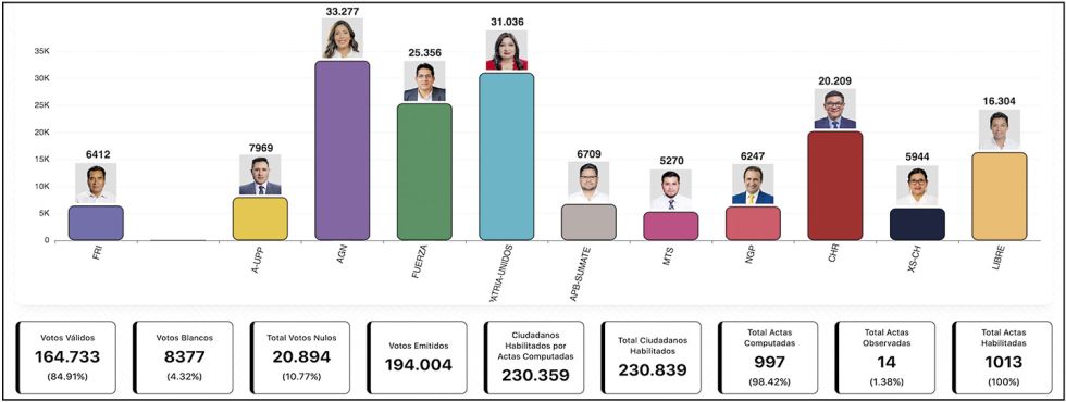 De acuerdo con los datos oficiales del Sistema de Resultados Preliminares (Sirepre), al 98,4% de las actas transmitidas, Tardío obtuvo 33.227 votos (20,2%) frente a los 31.036 sufragios alcanzados por Dalenz (18,8%). Ambas figuras irrumpieron en el escenario político local bajo el perfil de candidatas ‘outsider’ y polarizaron la preferencia del electorado en la recta final de la contienda municipal, donde Dalenz se quedó a muy poco de dar el golpe en las urnas.