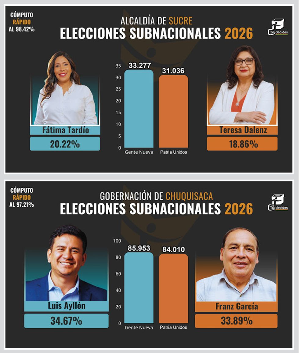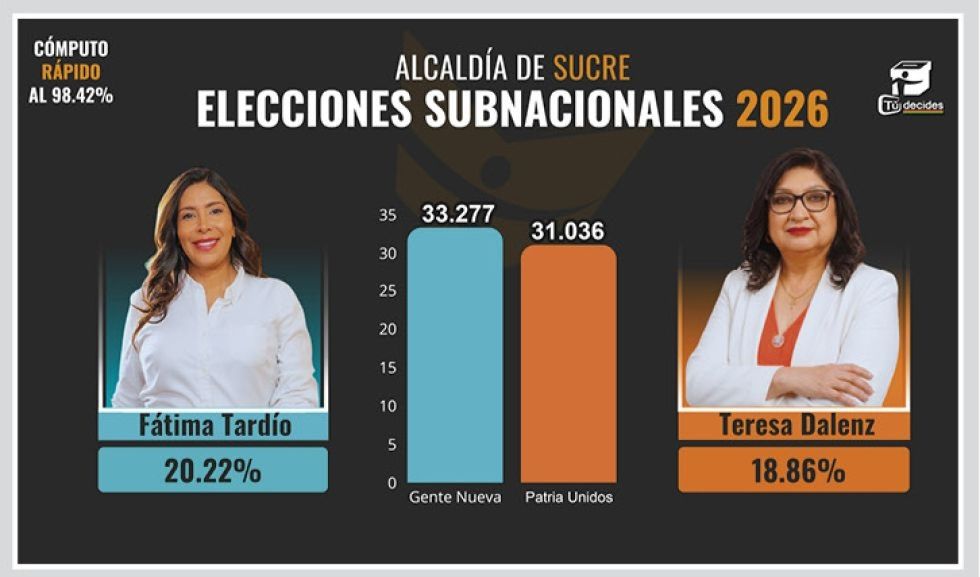 Fátima Tardío, de la Alianza Gente Nueva, ganó las elecciones subnacionales a la Alcaldía de Sucre que se desarrollaron este domingo. La postulante logró la victoria con una ajustada ventaja porcentual sobre María Teresa Dalenz, representante de Patria Unidos, en unos comicios marcados por la irrupción de nuevas figuras y el revés electoral del actual burgomaestre.