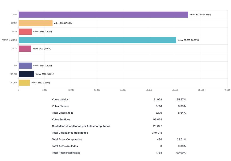 El escrutinio oficial, que hasta el cierre de esta edición totalizaba 496 actas procesadas de las 1.758 habilitadas, detallaba que Ayllón había conseguido 32.494 votos, frente a los 30.225 de García. La diferencia entre ambos era de 2,77 puntos porcentuales, consolidando así el escenario que ya habían adelantado los resultados preliminares del domingo.