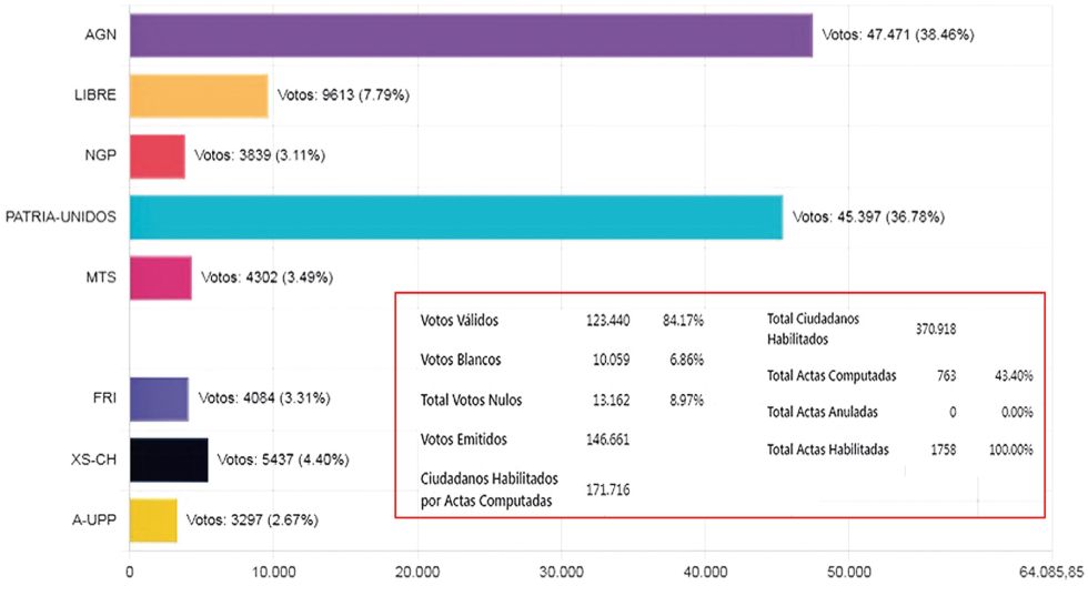 Por otro lado, el cómputo en Tarija se encontraba en su fase final, con un 96,89% de las actas ya escrutadas.