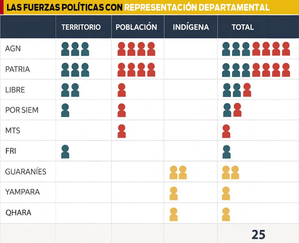 A estos 21 asambleístas se suman cuatro más: dos representantes del pueblo guaraní, uno de la nación Yampara y otro de Qhara Qhara, conformando un total de 25 miembros de la Asamblea Legislativa Departamental.