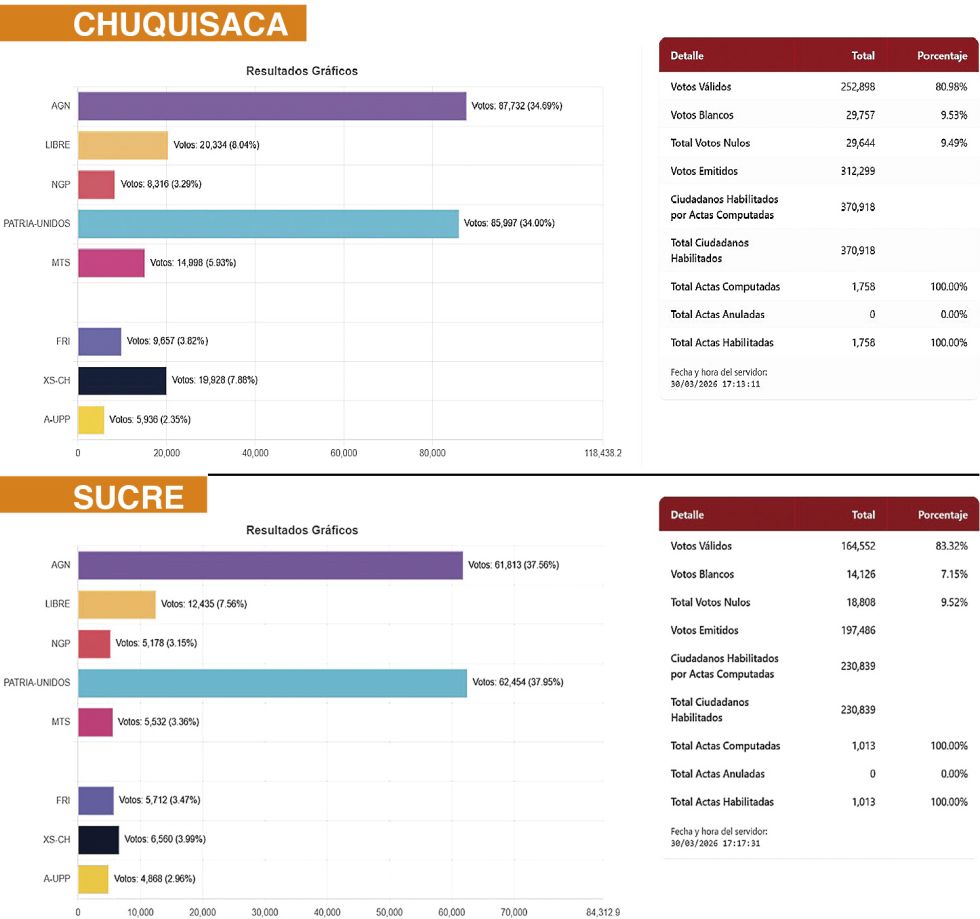 En Chuquisaca, Luis Ayllón, de Gente Nueva, ganó con 87.732 votos (34,69%), mientras que Franz García, de Patria Unidos, alcanzó 85.997 (34.00%). La diferencia: 1.735 votos.