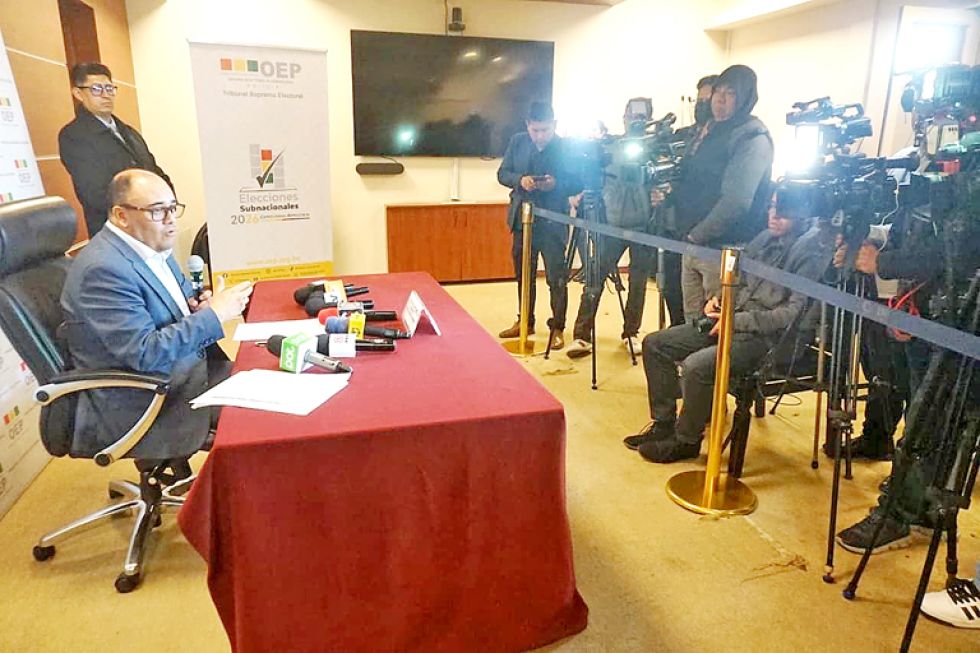 CONVOCATORIA. El presidente del TSE, Gustavo Ávila, anoche, durante su conferencia de prensa,. Foto: APG El Tribunal Supremo Electoral (TSE) convocó oficialmente a una segunda vuelta para la elección de gobernadores en los departamentos de Chuquisaca, La Paz, Oruro, Tarija y Beni. La jornada de votación se fijó para el domingo 19 de abril, según anunció la noche de este lunes el presidente del TSE, Gustavo Ávila. Aunque el balotaje en Santa Cruz es un hecho, su convocatoria formal se emitirá tras la repetición de la votación en 97 mesas.
