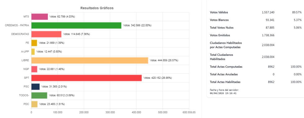 Con el 100% de las actas escrutadas, los resultados finales otorgan a Velasco un 28,57%, que representa 444.859 votos, mientras que Ritter obtuvo el 26,98%, equivalente a 420.152 sufragios. De acuerdo con la Ley del Régimen Electoral 026, la segunda vuelta se activa al no haber alcanzado ningún candidato más del 50% de los votos válidos, o un mínimo del 40% con una diferencia de 10 puntos sobre el segundo.