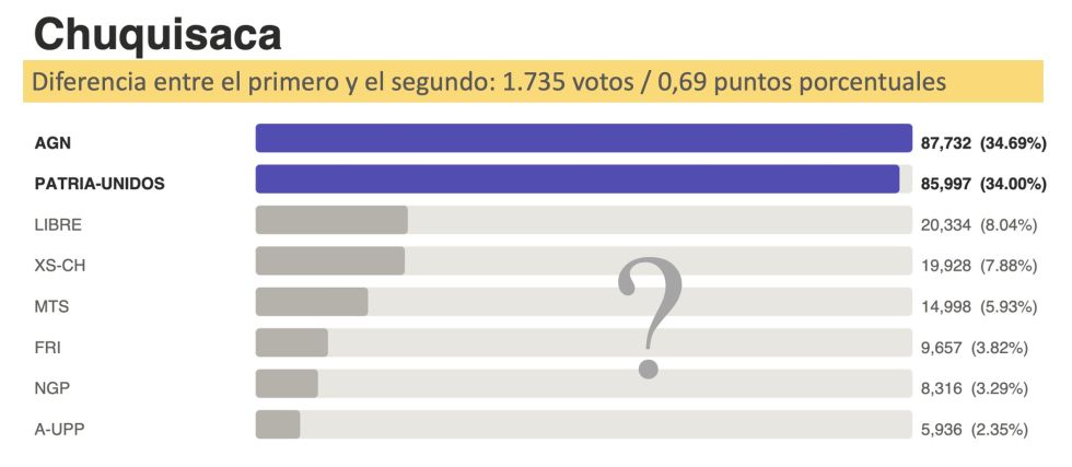 Chuquisaca es el balotaje más abierto. Luis Ayllón, de la Alianza Gente Nueva (AGN), obtuvo 87.732 votos (34,69%), y Franz García, de Patria-Unidos, 85.997 (34,00%). Los separan 1.735 votos, el 0,69% de los sufragios válidos del departamento. En la capital, Sucre, la diferencia es aún más estrecha: apenas 641 votos, esta vez a favor de Patria-Unidos.