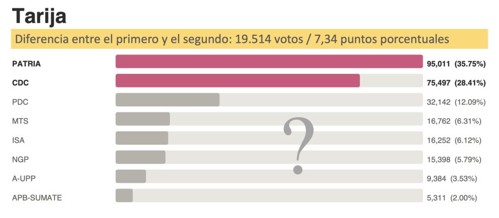 Adrián Oliva, de Patria, lideró la primera vuelta con 95.011 votos (35,75%), seguido de María René Soruco, del CDC, con 75.497 (28,41%). La diferencia de 19.514 votos proviene principalmente del interior del departamento: en la ciudad capital, los dos finalistas quedaron separados por apenas 1.101 sufragios, un empate técnico que convierte a Tarija capital en un campo de batalla abierto para el balotaje.