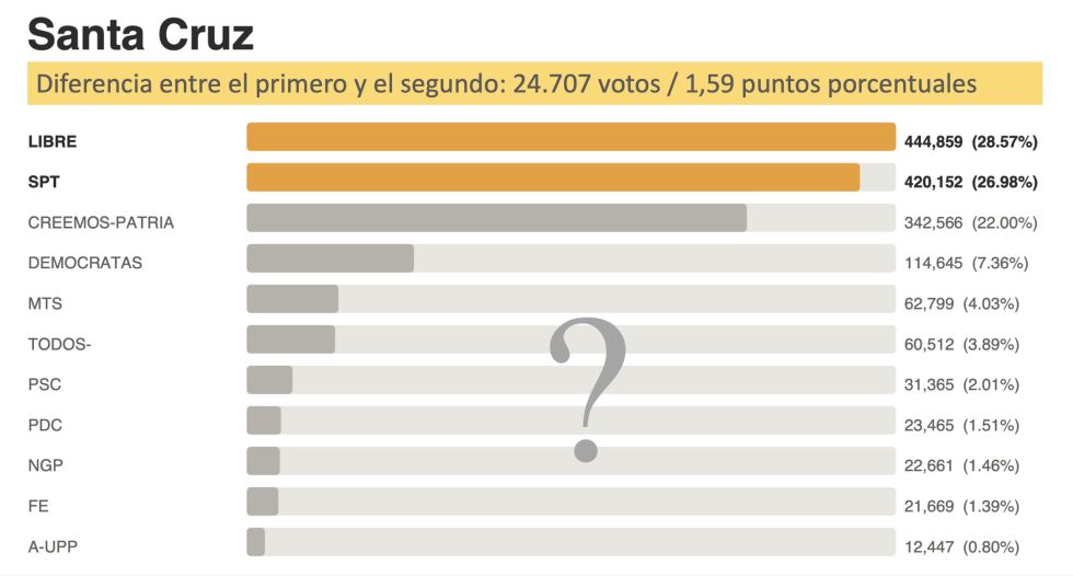 El problema para Libre radica en el bloque de fuerzas políticas que quedaron fuera: los votos de todos los candidatos que no pasaron a la segunda vuelta suman 692.129, de los cuales 342.566 corresponden a Creemos-Patria, el tercer partido más votado. Si SPT lograra captar una buena parte de ese bolsón y consolidar el bolsón de Demócratas (114.645 votos) –su candidato, Branko Marinkovic le expresó apoyo recientemente–, tendría una ventaja decisiva sobre Libre.