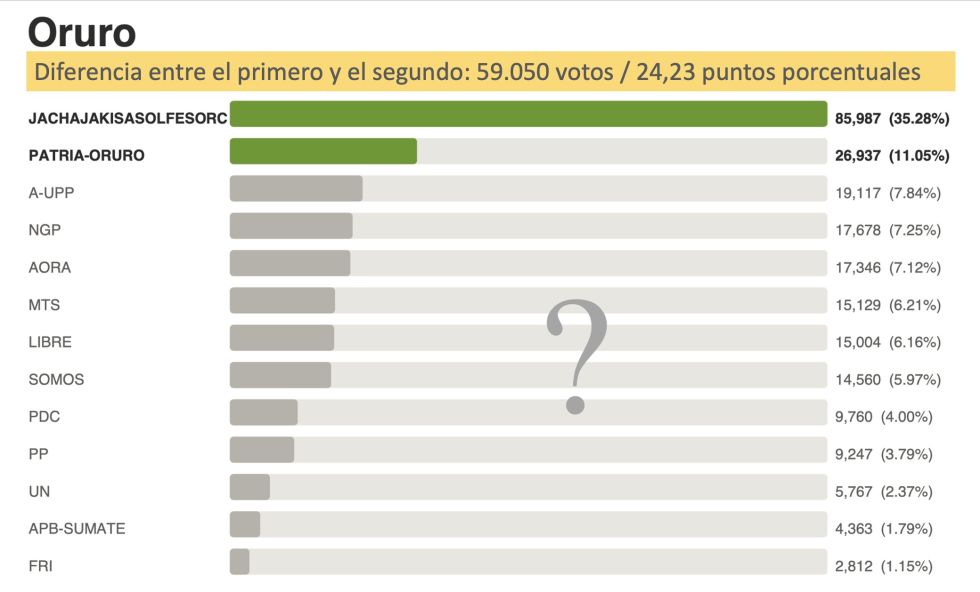 El departamento más claro de los cinco es Oruro. Edgar Sánchez, de Jach’a, obtuvo 85.987 votos (35,28%) en la primera vuelta, frente a los 26.937 (11,05%) de Óscar Chambi, de Patria-Oruro. La brecha de 59.050 votos y 24 puntos porcentuales se replicó en similar proporción tanto en la capital como en el interior del departamento, lo que convierte esta elección en una rareza, donde generalmente los candidatos urbanos pierden fuerza en las provincias o viceversa.