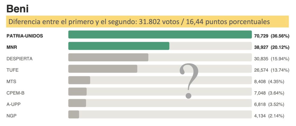 En Beni, Patria-Unidos, con Hugo Vargas, obtuvo 70.729 votos (36,56%) frente a los 38.927 (20,12%) del MNR, con Jesús ‘Tito’ Égüez. La diferencia de 31.802 sufragios y más de 16 puntos es importante, y se replica en la capital Trinidad, donde Patria-Unidos casi triplicó al MNR.