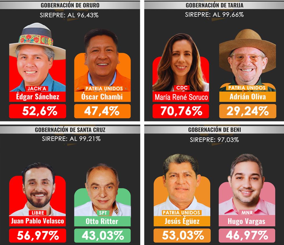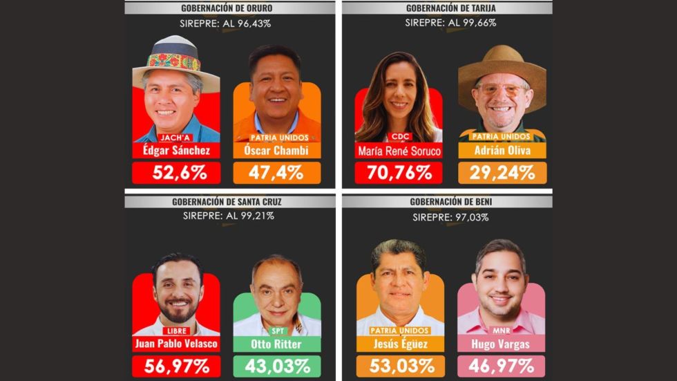 La elección subnacional en su primera y segunda vuelta reconfiguró el mapa electoral del país. En los departamentos de Potosí y Cochabamba, los gobernadores fueron electos en primera vuelta. René Joaquino, exalcalde y exsenador de Potosí, se impuso con una amplia diferencia. En tanto, el exsenador Leonardo Loza, aliado del expresidente Evo Morales, asumirá la Gobernación de Cochabamba tras alcanzar el cargo sin necesidad de balotaje. Ambos no responden a la línea oficialista.