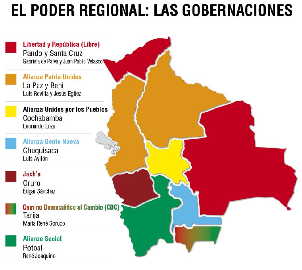 Alianza Patria logró acuerdos regionales y obtuvo la Gobernación de La Paz con Luis Revilla, quien accede tras una decisión administrativa del Tribunal Supremo Electoral (TSE), luego de que Nueva Generación Patriótica (NGP) desistiera de participar en el balotaje, dejando a su candidato, René Yahuasi, fuera de la contienda.