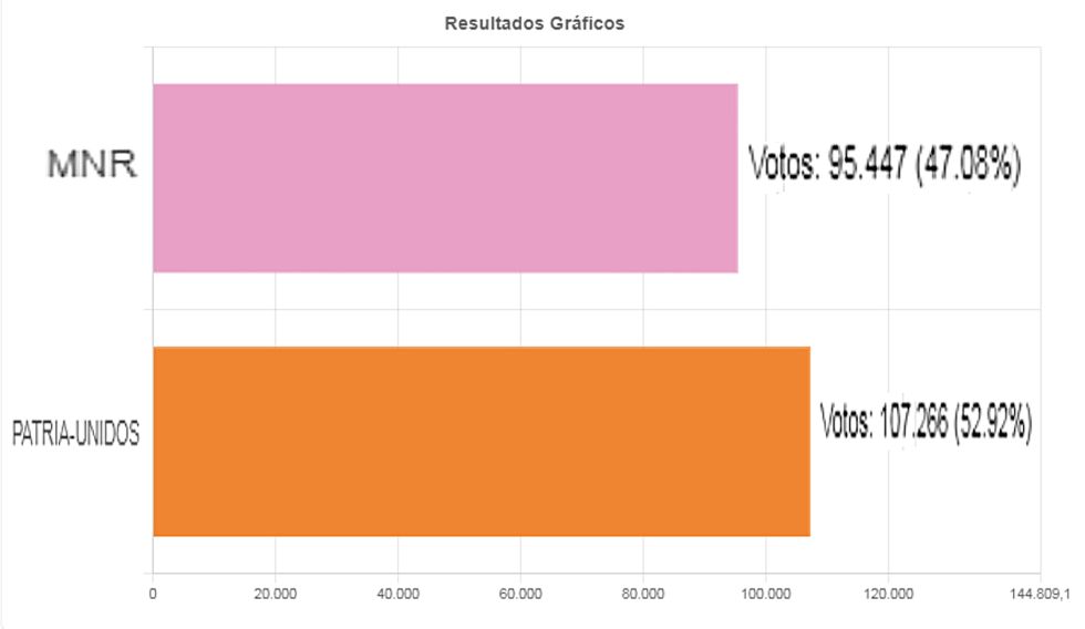 Los datos actualizados otorgaban la victoria parcial a Jesús Egüez, de la alianza Patria-Unidos, con el 52,92% de los sufragios, equivalentes a 107.266 votos. Por su parte, Hugo Vargas, del Movimiento Nacionalista Revolucionario (MNR), registraba el 47,08%, con 95.447 apoyos.