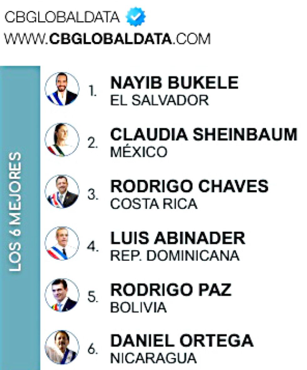 De acuerdo con el estudio, Bukele lidera la lista con un 70,1% de imagen positiva frente a un 26,3% de desaprobación. El mandatario centroamericano, que recientemente asumió un segundo mandato, mantiene una política de mano dura contra las pandillas. En segundo lugar se posiciona Sheinbaum, quien asumió el poder en octubre de 2024 y alcanza un 69,8% de aprobación. El podio lo completa Rodrigo Chaves de Costa Rica, con un 59,5% de favorabilidad.