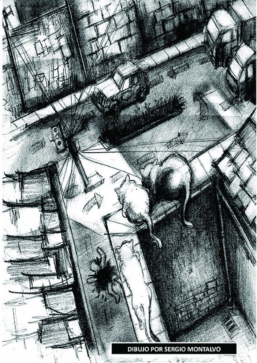 Subió al tejado y muchos de los vecinos se aproximaron a ver¬la. Doña Lidia rehuía de todos, emitía grandes maullidos, senta¬da, pronunciando sus gordas curvaturas como si se tratase de un verdadero felino. Huyó hasta que se halló acorralada y vio el techo de la casa vecina y se aproximó corriendo y dio un brinco y falló... su cuerpo no tardó en terminar contra el suelo, con la cabeza reventada y la sangre esparcida en la vereda.