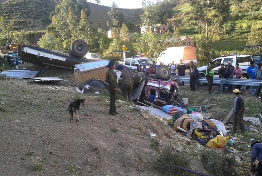 EN TARABUCO. El vuelco del camión Nissan Cóndor ocurrió la tarde de ayer, en la carretera, a unos 40 kilómetros de Sucre En un fatal accidente en el poblado de La Ciénega del municipio de Tarabuco, a 40 kilómetros de Sucre, un camión marcha Nissan Cóndor volcó de costado y se estrelló contra una peña dejando como saldo siete personas fallecidas no identificadas hasta anoche y 33 heridos.