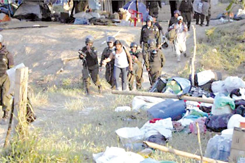 El 25 de septiembre de 2011, un operativo de al menos 500 policías intervino de forma violenta la marcha en defensa del TIPNIS en la comunidad de San Miguel de Chaparina (Beni). Los pueblos indígenas protestaban por la anunciada construcción de una carretera que uniría Villa Tunari, en el departamento de Cochabamba, con San Ignacio de Moxos, en el departamento de Beni, la cual pasaría directamente por su territorio. A través de imágenes difundidas por televisión pudo constatarse cómo los uniformados golpearon, maniataron y amordazaron con cinta adhesiva a los manifestantes. Mujeres y niños también fueron afectados