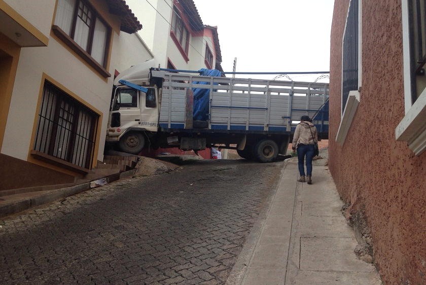 Un camión marca Nissan Cóndor, en el que se vendía choclos en la calle Nataniel Aguirre, chocó contra una vivienda de la calle 29 de Septiembre, luego que el chofer intentara encender el vehículo con el impulso al descender la pendiente.