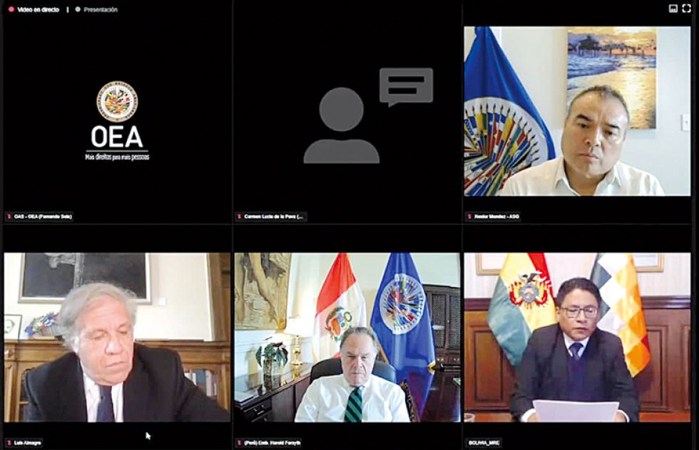 SESIÓN. En la sesión virtual del Consejo Permanente de la OEA participaron 17 países miembros. Foto: Captura de video El Gobierno de Bolivia acusó a la Organización de los Estados Americanos (OEA) y, en particular, a su secretario general, Luis Almagro, de “grosera injerencia”. La respuesta a esas alusiones no se dejó esperar.