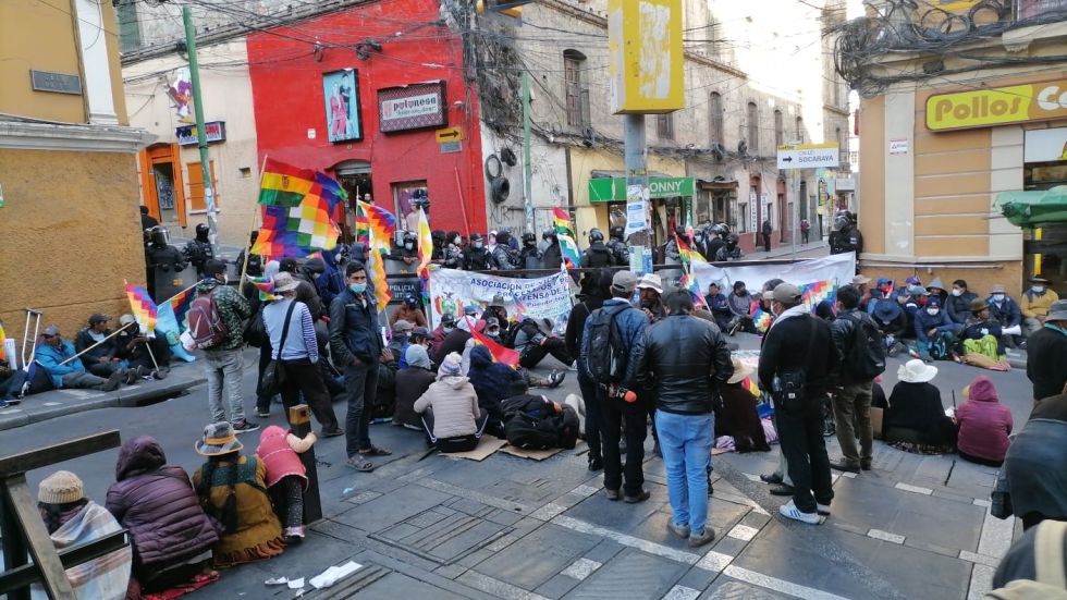 Tras una semana de caminata, desde la localidad de Caracollo, la columna de personas arribó este jueves a la sede de gobierno. Cuando llegaron a la calle Potosí y Socabaya, a una cuadra de la Plaza Murillo, un fuerte contingente policial impidió su ingreso.