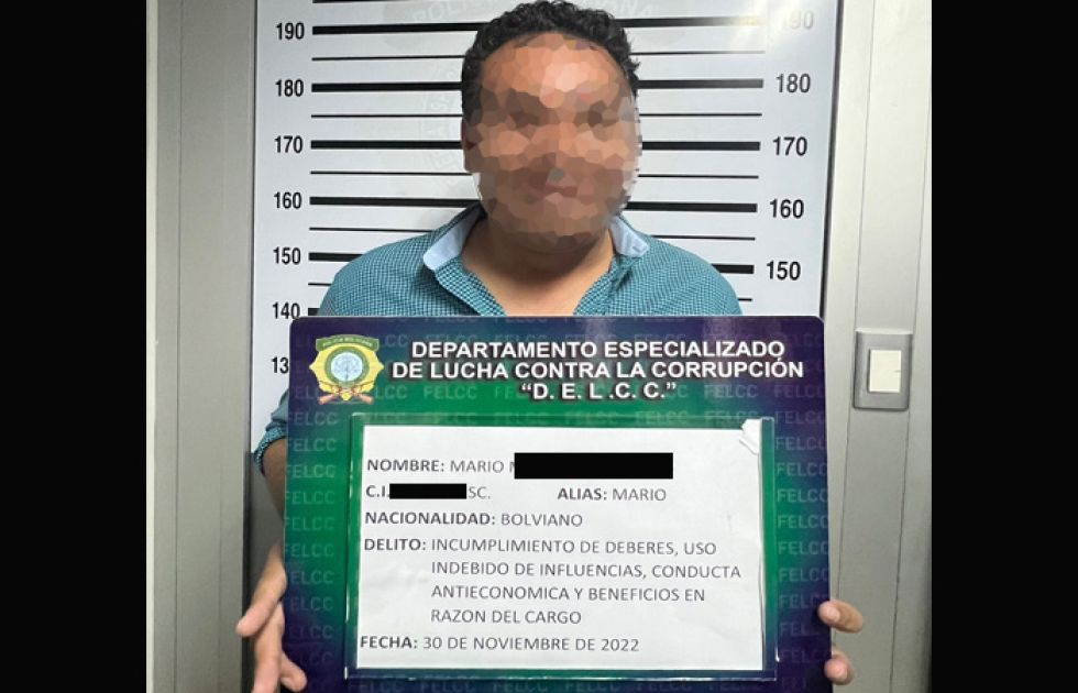 El reporte precisa que este miércoles personal especializado de la División de Lucha Contra la Corrupción de Santa Cruz recibió la declaración informativa de Mario M.J., quien se acogió al derecho constitucional de guardar silencio, por lo que la fiscal dispuso su aprehensión y cerca de las 17:00 horas, fue notificado con la resolución de imputación formal.