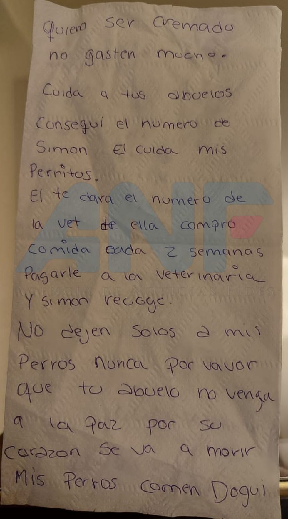 “Quiero ser cremado, no gasten mucho”, escribió Rivas en una servilleta. Además, a quien dirige la nota le pide cuidar a “tus abuelitos”.