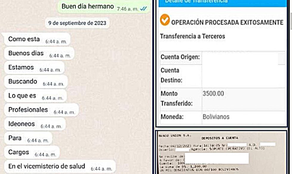 La viceministra Ríos informó que esta persona se contactaba con otras para pedirles sus hojas de vida, mientras que a empresas les ofrecía contratos a cambio de sumas de dinero. Los pagos se concretaban mediante QR y depósitos bancarios.