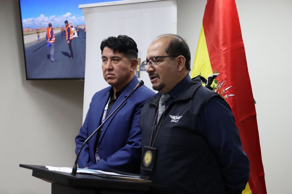 El director de DGAC, Iván García, y el director de Naabol, Elmer Pozo, en una conferencia de prensa. Foto: Jorge Surco/APG Navegación Aérea y Aeropuertos Bolivianos anunció este miércoles que inició un proceso de investigación sobre el choque de un avión de Boliviana de Aviación (BoA) a una jauría de perros en plena pista del aeropuerto internacional de El Alto.