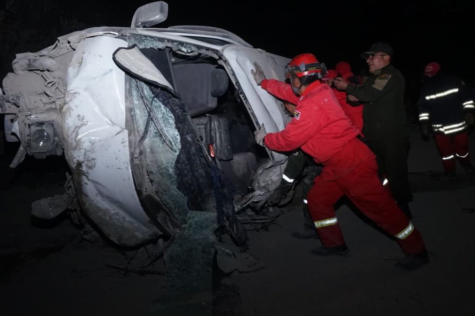 Las tareas de rescate de las personas que quedaron atrapadas dentro del minibús fueron muy complicadas por el estado en que quedó el vehículo, por la escasa visibilidad del sector y el polvo que quedó esparcido en todo el sector.