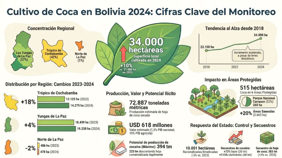 Los cultivos de hoja de coca en Bolivia registraron un incremento de 10%, al pasar de 31.000 hectáreas en 2023 a 34.000 hectáreas en 2024, informó este lunes la Oficina de las Naciones Unidas contra la Droga y el Delito (Unodc, en inglés).