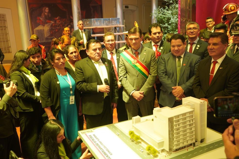 El fiscal general del Estado, Roger Mariaca, durante el aniversario de la gesta libertaria de Oruro, realizó la presentación de la maqueta para la construcción del edificio de la Fiscalía Departamental de Oruro e Instituto de Investigaciones Forenses (IDIF), un proyecto que fue compartido al presidente Rodrigo Paz, con el fin que apoye la ejecución del mismo.