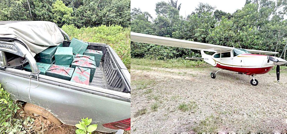 Posteriormente, la patrulla antidrogas aseguró el área y constató que la avioneta se encontraba sin ocupantes ni droga en su interior. Minutos después, durante un rastrillaje que se realizó en la ruta por donde huyó el dirigido el grupo de los antisociales, se localizó la camioneta a unos 500 metros del punto de aterrizaje, abandonada y enfangada. Al revisar el interior se contabilizaron 28 bolsas de yute con bloques tipo ladrillo de la sustancia controlada, algunas marcadas con la sigla “CH”.