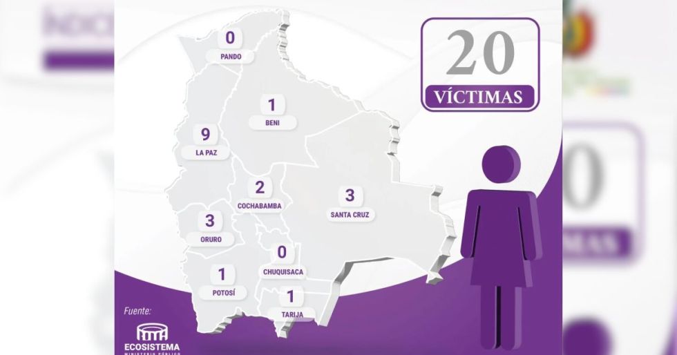 De acuerdo a datos del Ministerio Público, de enero al 16 de marzo, 20 mujeres fueron víctimas de feminicidio: nueve en La Paz, tres en Santa Cruz, tres en Oruro, dos Cochabamba, uno Beni, uno Potosí y uno Tarija.