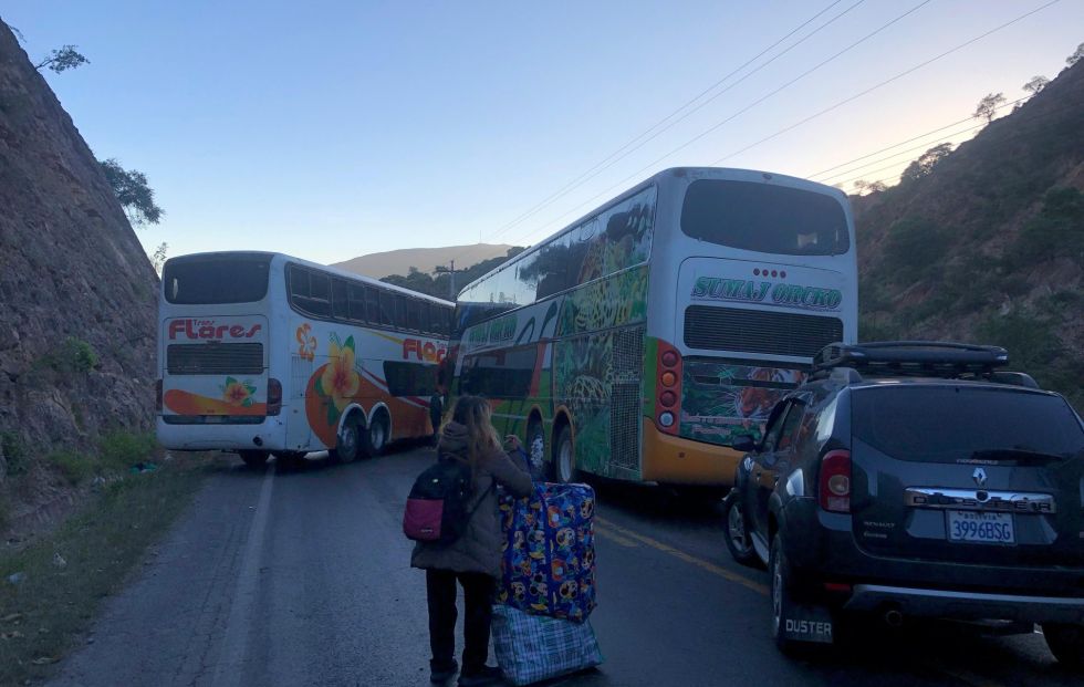 Por el bloqueo, varios buses provenientes del occidente del país quedaron detenidos en la vía, obligando a los pasajeros a descender y continuar a pie, incluso cargando su equipaje.