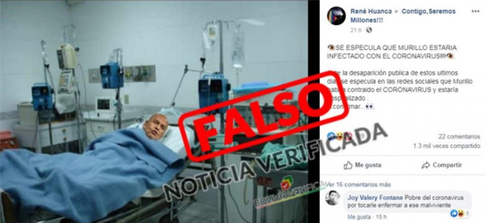En otro caso, la plataforma evidenció que una foto con reseña de críticas del candidato presidencial del MAS, Luis Arce, a la canasta familiar, no fue difundida por Notivisión de la Red Uno; también tachó de “fake news” un posteo en Facebook que mostraba una imagen del ministro de Gobierno, Arturo Murillo, supuestamente hospitalizado y víctima de coronavirus.