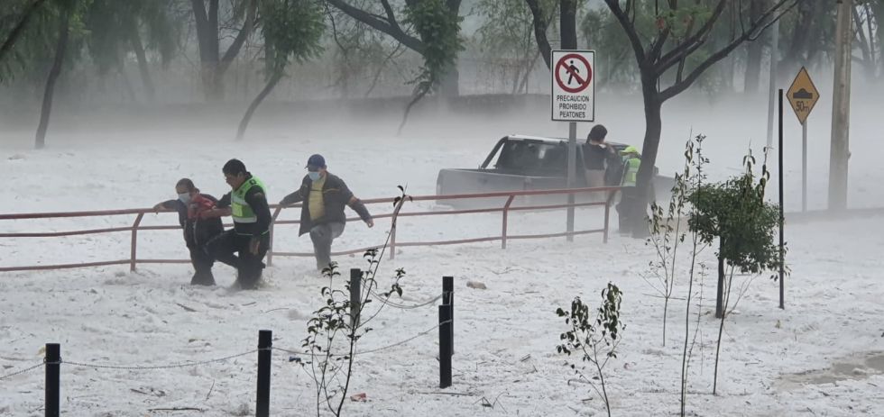 Las cercanías del mercado Abasto también se vieron afectadas. En ese lugar, no solo se registraron inundaciones, sino que un vehículo quedó cubierto por el granizo.