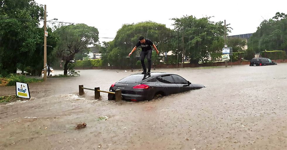 La ciudad de Santa Cruz amaneció ayer, miércoles, con los barrios inundados, vehículos varados y vuelos afectados por una torrencial lluvia que alcanzó los 100 litros por metro cuadrado. La gran cantidad de agua colapsó los canales de drenaje; conductores y peatones vivieron situaciones de peligro que no derivaron daños personales, pese al arrastre de motorizados por la fuerza del agua.