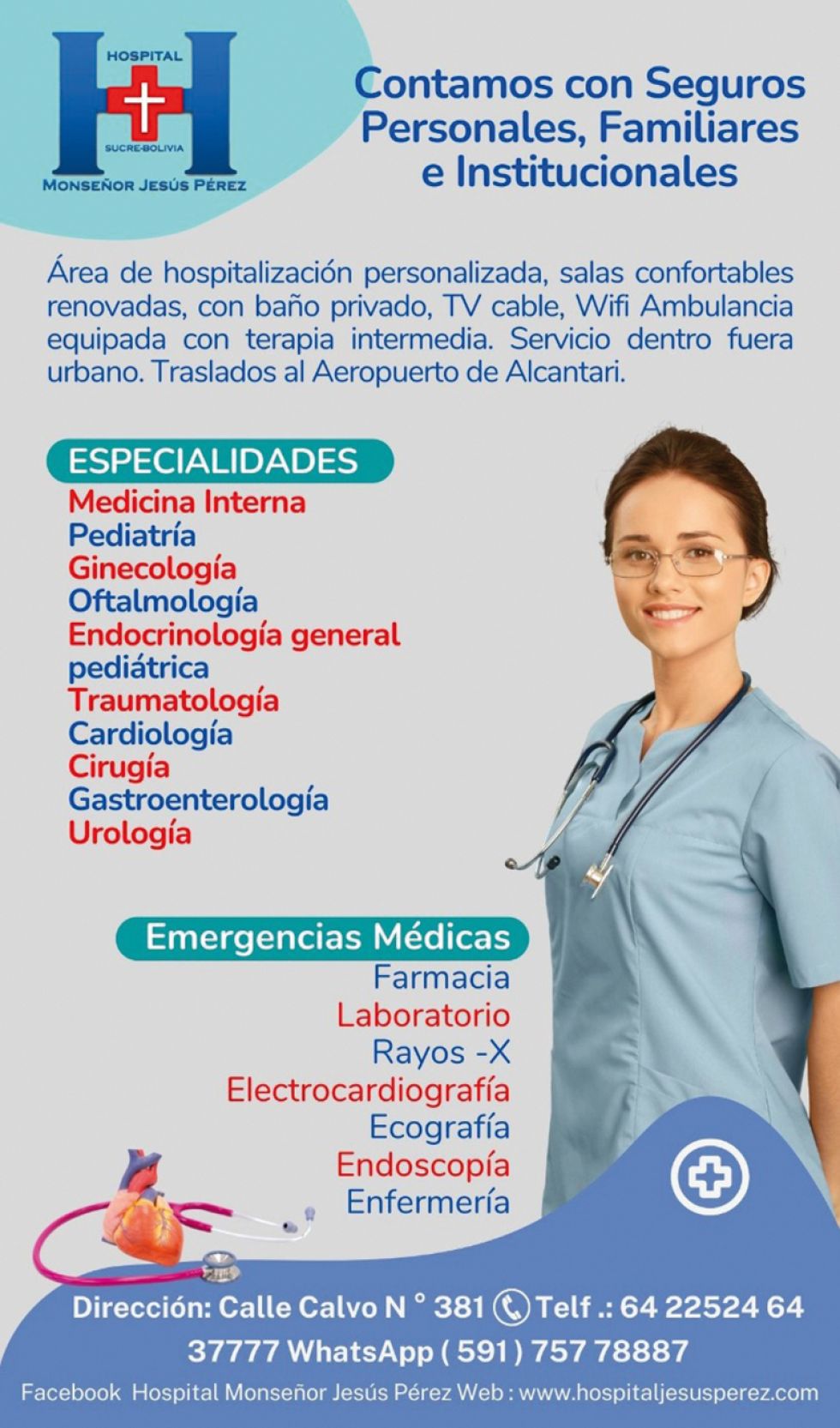 El Hospital Monseñor Jesús Pérez, completamente privado, que funciona hace 22 años en Sucre, es dirigido desde el 2016 por los esposos Céspedes, Cristina y Antonio, ambos vinculados profesionalmente al área de la salud que le dan un renovado impulso al hospital preferido en el centro de la ciudad.