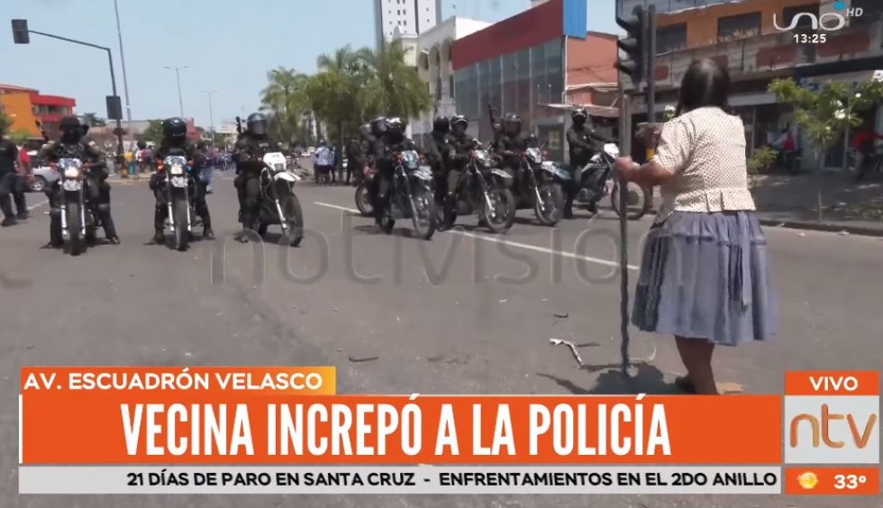 “Yo vivo 52 años aquí (…) Mátenme a mí. Yo no tengo miedo. (…) Yo soy cruceña (…) Si me matan, mátenme (…) Santa Cruz es mi casa”, exclamó la mujer frente a unos efectivos de la UTOP, en medio de los enfrentamientos que se registraron el viernes en la capital cruceña.
