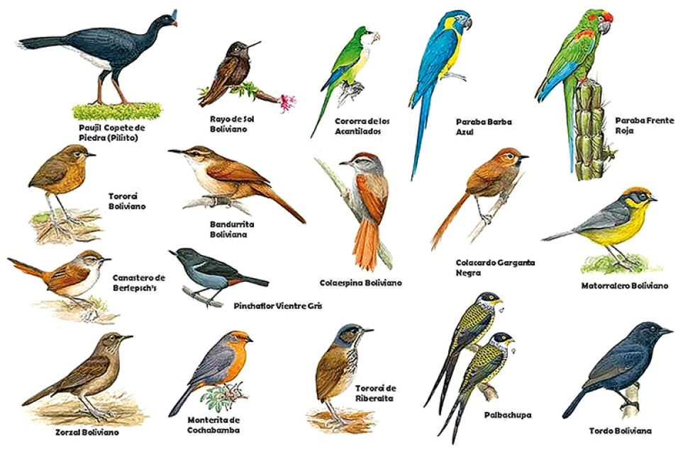 AVES. La lista de aves endémicas de Bolivia correspondiente al año 2021, de acuerdo con un reporte de la página especializada Birdnerds. Foto: BIRDNERDS Bolivia destaca como el sexto país con mayor diversidad de aves a nivel mundial y el quinto más rico en especies de aves que no tiene costa, albergando a 1.445 especies, entre ellas 16 endémicas que solo habitan en nuestro territorio, según datos de la Unión Internacional para la Conservación de la Naturaleza (IUCN). Desafortunadamente, 48 de estas especies enfrentan amenazas a corto y mediano plazo, lo que muestra la urgencia de implementar medidas de conservación efectivas.