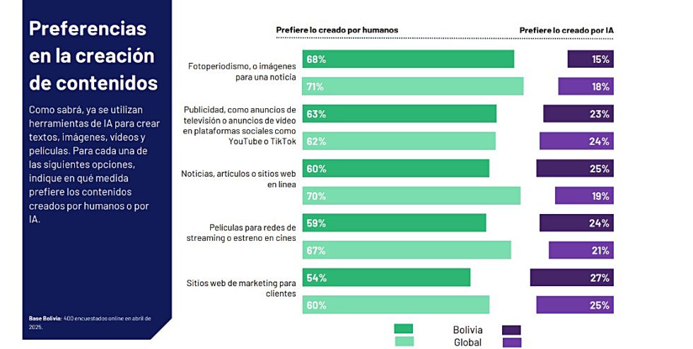 ¿Los encuestados prefieren lo creado por humanos por sobre la generación de la IA? En Bolivia, el 68% lo prefiere en el caso de fotoperiodismo, el 63% lo prefiere para publicidad y el 60% para noticias y contenidos similares.